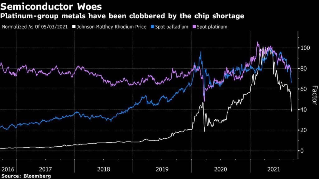 Platinum-group prices are being hammered by the chip shortage