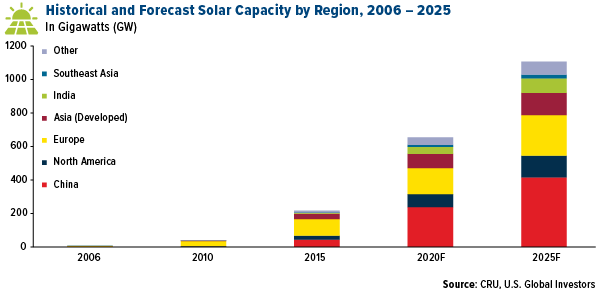 According to a report by CRU Consulting, solar power generation will increase to 1,053 terawatt hours (TWh) by 2025, close to double the amount that was generated in 2019. Amazon alone is planning five major solar projects around the world, including its first in China, as the retail giant seeks to reach 80% renewable energy by 2024 and 100% by 2030. Once completed, these five projects will generate 1.2 million megawatt hours (MWh) of energy every year, or enough to power 113,000 average U.S. homes.