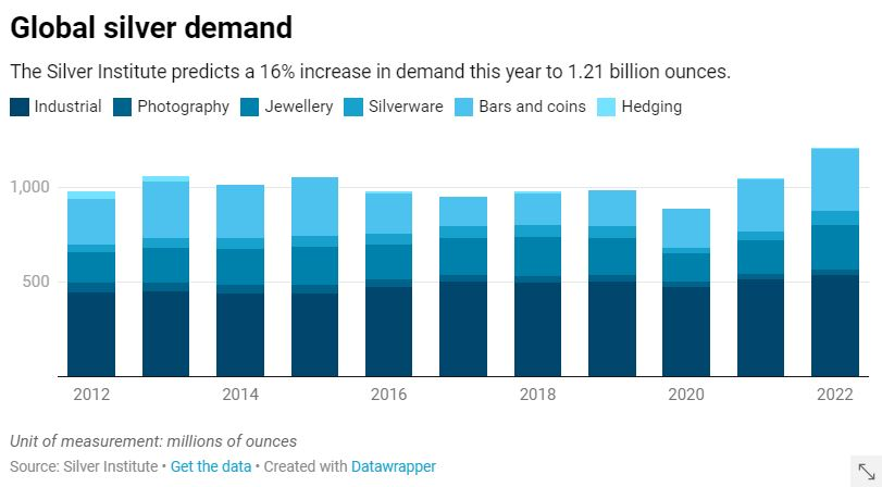 Silver is used in many industries including electronics and solar panels, and demand is expanding as the world moves away from fossil fuels.