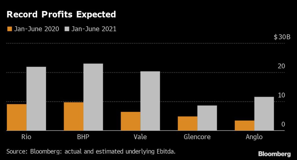 The top-five western diversified miners may have earned a combined $85 billion for the first half of the year, according to analyst estimates, more than double the level from a year ago. Rio Tinto Group, the first to report on Wednesday, is expected to announce $22 billion of profit for the six months, on a par with its total for all of 2020.