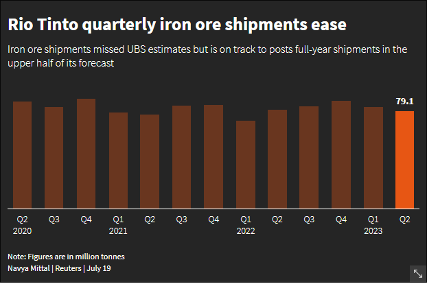The Anglo Australian miner recorded a small miss on its second-quarter iron ore shipments on Wednesday, hurt by a train derailment during the quarter, but said it was on track for full-year shipments in the upper half of its forecast range of 320 million to 335 million metric tons.