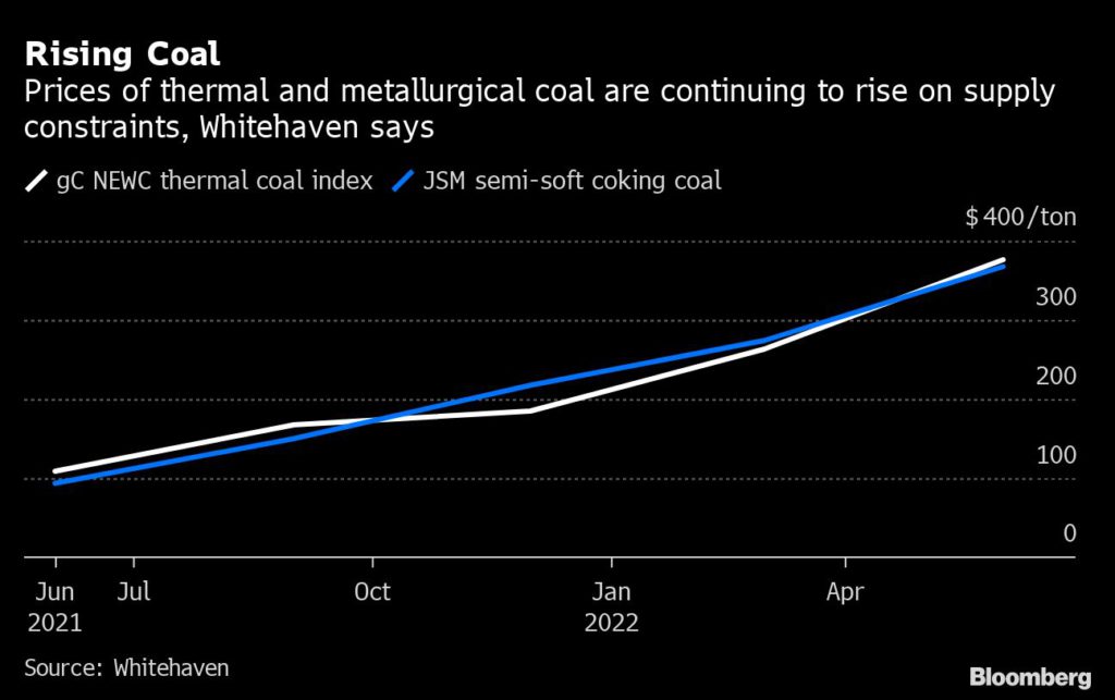 Global supply constraints and strong demand pushed Asia’s benchmark Newcastle thermal coal to a quarterly record of $377 a ton in the three months through June, Whitehaven Coal Ltd. said Monday in a statement. The company expects to report a jump in earnings to A$3 billion ($2 billion) from A$204.5 million when it next month reports financial-year results.