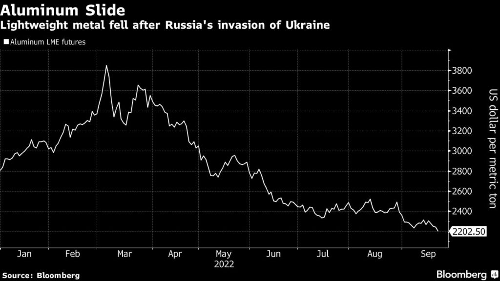 Aluminum prices are down more than 20% this year as demand across the globe has been hit by inflation, supply-chain issues and surging energy prices across Europe. The regional price to ship aluminum in the US is near the lowest since December, indicating demand for appliances and automobiles to window frames are shrinking in the face of uncertain economic headwinds in the world’s largest economy.