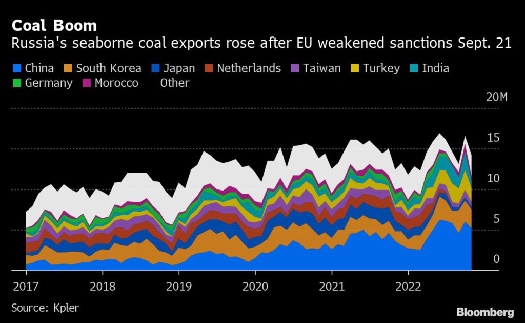 Europe is still not allowed to import Russian coal, but European companies are now allowed to ship the commodity to third countries. Russian coal sales to Asia boomed immediately after Moscow’s invasion of Ukraine as it redirected some of its European exports, but the country faces higher shipping costs as it sells to customers further away.