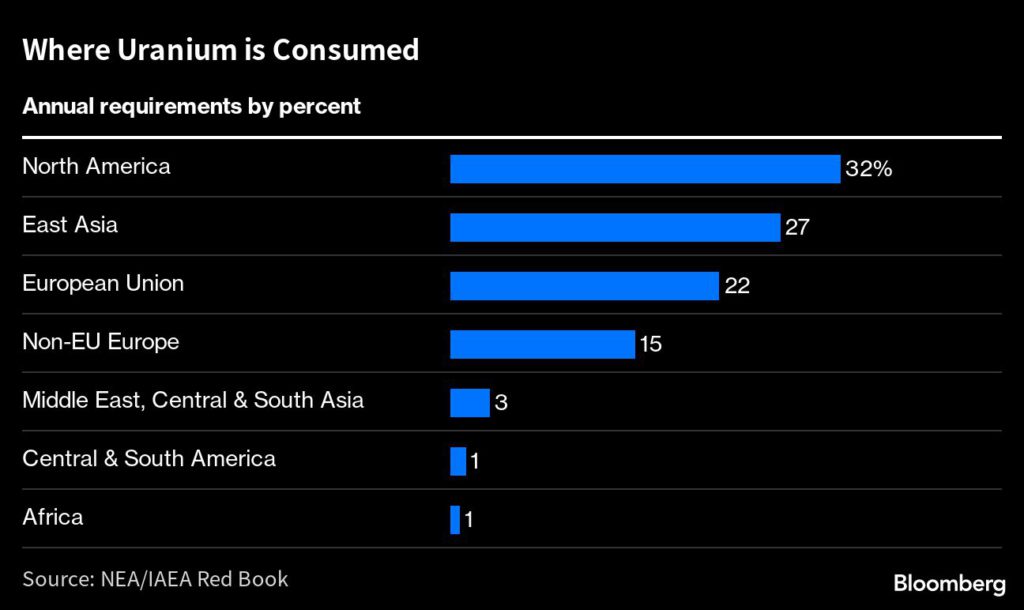 Rather than finding new deposits, the more immediate challenge for uranium markets could be solving the mismatch between nations that produce and consume the metal. The US, which has the biggest fleet of nuclear reactors, can only supply 1% of its demand.