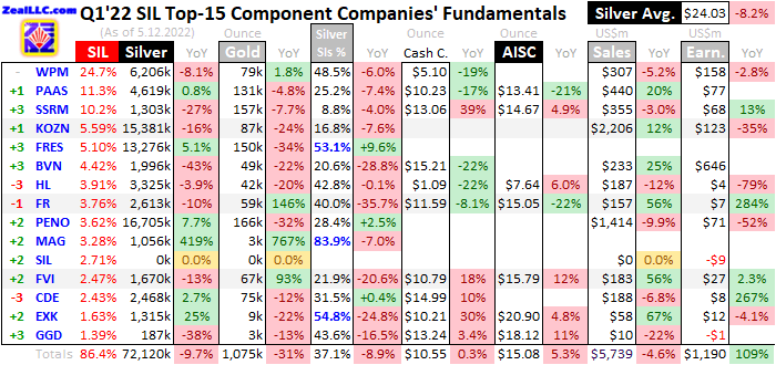 This table summarizes the operational and financial highlights from the SIL top 15 during Q1’22. These major silver miners’ stock symbols aren’t all US listings, and are preceded by their rankings changes within SIL over this past year. The shuffling in their ETF weightings reflects shifting market caps, which reveal both outperformers and underperformers since Q1’21. Those symbols are followed by current SIL weightings.