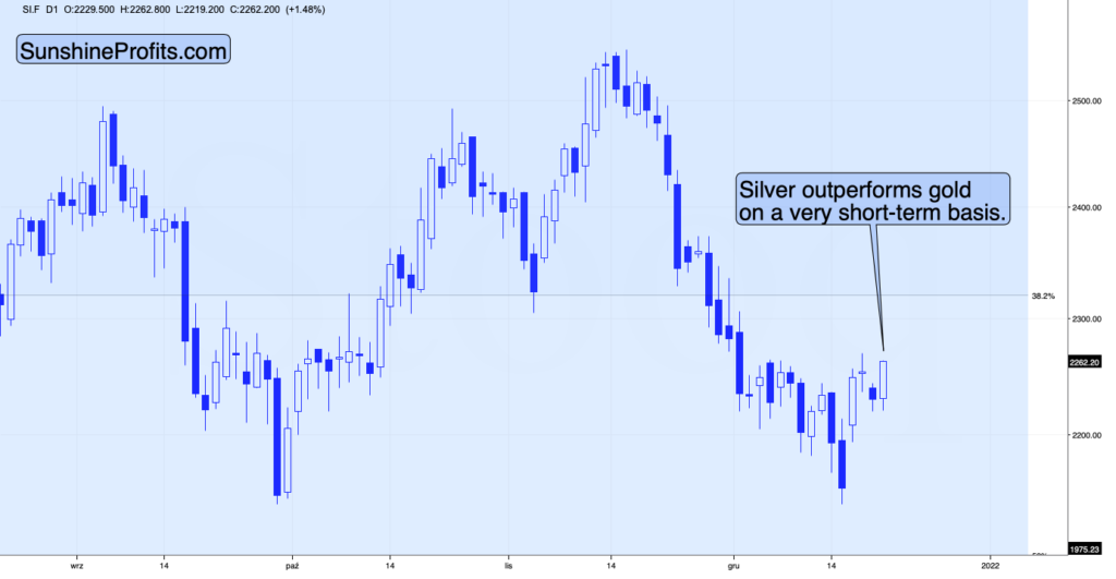 Getting back to silver’s relative performance, it’s been weak when taking into account the last couple of weeks – please note how little of the recent monthly decline silver has corrected compared to gold. Gold recently moved to its October highs, but silver topped a few dollars below its October high. What does it tell us? Silver is likely to fall hard, also compared to gold, probably in tune with the general stock market – similarly to what happened in 2008 and 2020. That’s the same kind of performance that we saw in the very early parts of the huge declines.