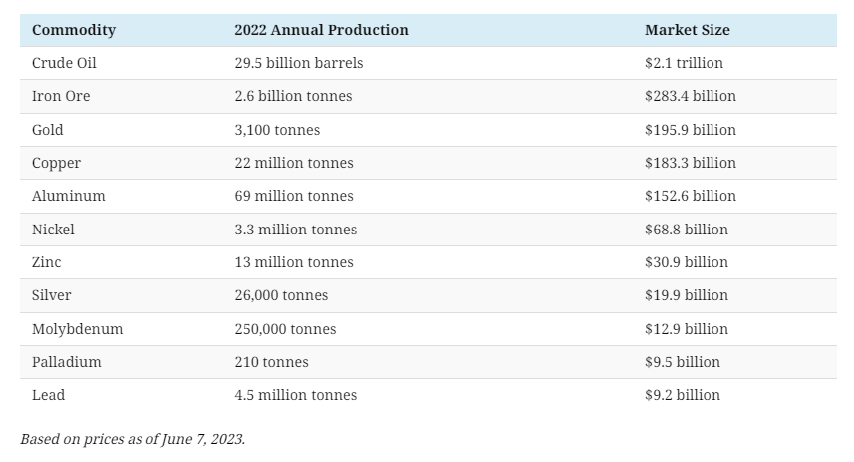 The combined market size of the top 10 metal markets amounts to $967 billion, less than half that of the oil market. In fact, even if we added all the remaining smaller raw metal markets, the oil market would still be far bigger.