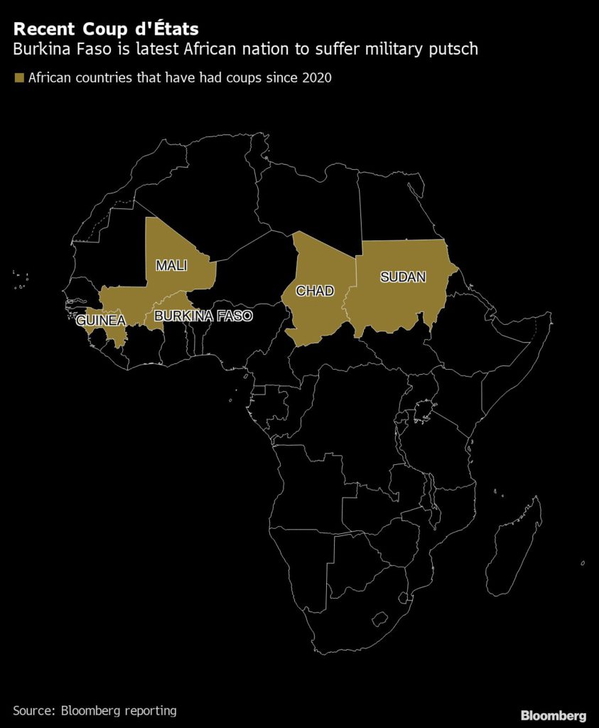 The military takeover was necessary because Kabore was unable to tackle insecurity “that threatens the very foundation of our nation,” according to a statement signed by Colonel Paul-Henri Sandaogo Damiba and read by another officer on Radio Television du Burkina Monday. The country will return to constitutional order within a “reasonable timeframe,” he said.