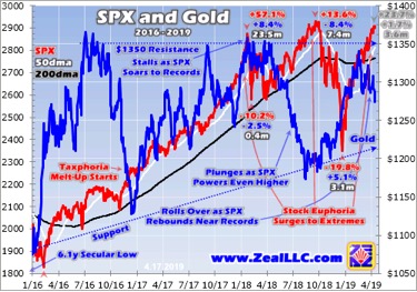 The greater stock-market euphoria, for the most part the weaker gold investment demand and thus gold prices. And of course euphoria is a direct function of how high the stock markets are. The SPX has surged to record and near-record levels 3 times over the past 15 months or so. It peaked at 2872.9 in late January 2018, 2930.8 in late September 2018, and has shot as high as 2907.4 so far in mid-April 2019.