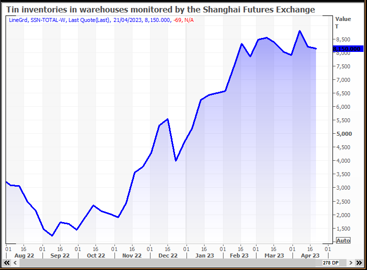 Tin inventories in warehouses monitored by the Shanghai Futures Exchange at 8,150 tonnes are up 570% since September last year.