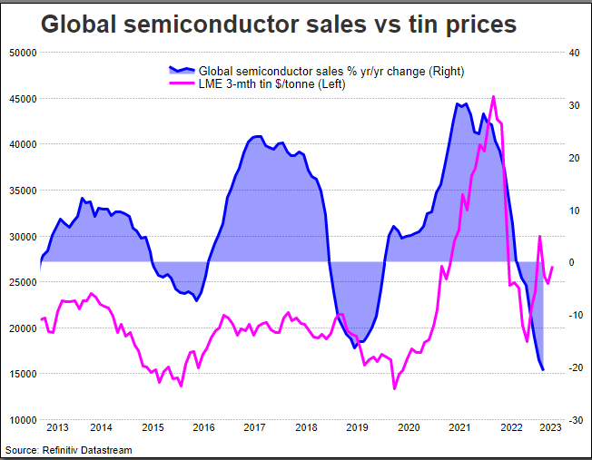 More than half of global tin supply is used as solder for circuit boards for the semiconductor industry, which is expected to consume less tin due to an economic slowdown and a brake on spending on consumer electronics.