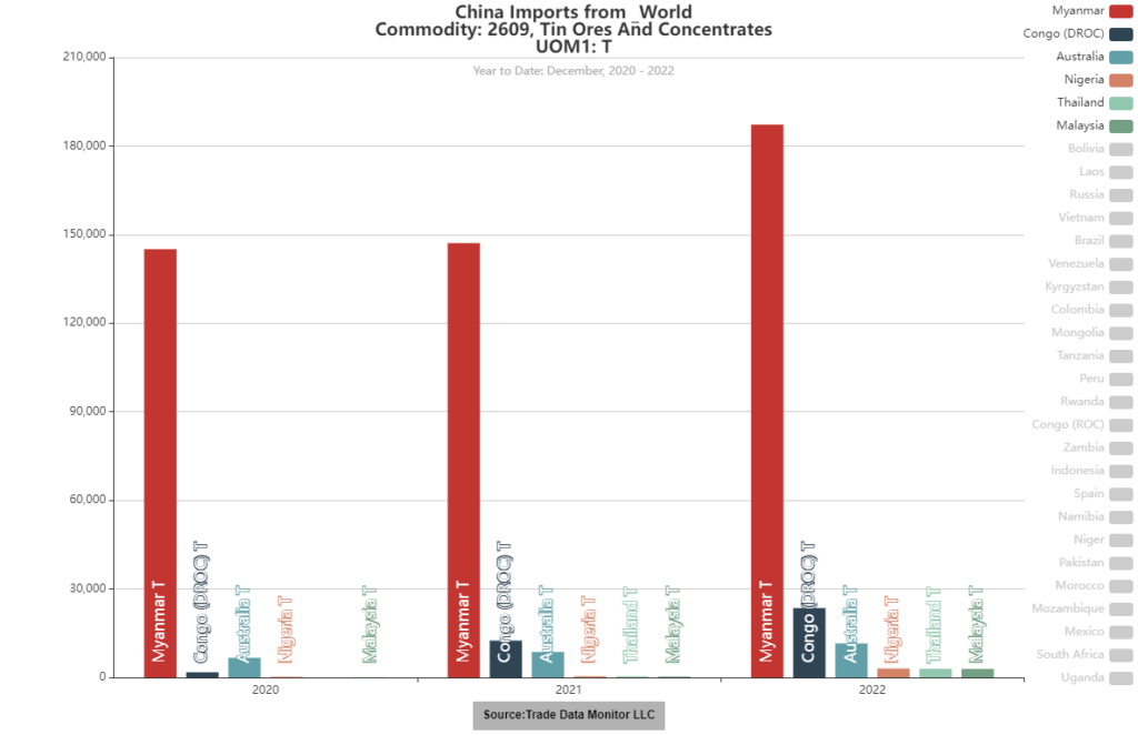 The International Tin Association (ITA) estimates Wa State represents about 10% of the world’s tin concentrate supply and that China accounted for about 47% or 181,000 tonnes of tin consumption last year of which 47,700 tonnes, or 26%, came from Myanmar.