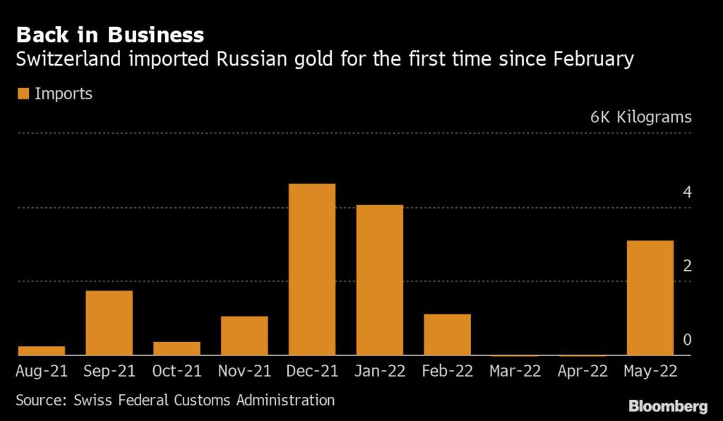 Over 3 tons of gold — worth about $200 million — was shipped from Russia to Switzerland in May, almost all of which was marked as being for refining, according to data from the Swiss Federal Customs Administration. It was the first recorded shipment between the countries since February, when the war in Ukraine began.