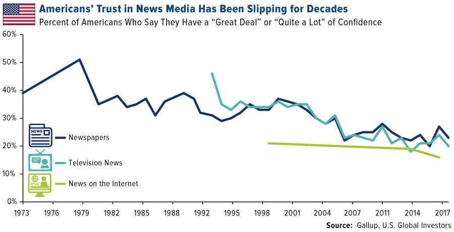 Just take a look at the chart below, based on Gallup polling data going back to 1973. Whether it’s newspapers, television news or, more recently, online news, Americans’ faith is steadily eroding. Last year, the percent of Americans who said they have a “great deal” or “quite a lot” of confidence in newspapers stood at a near-record low of 23 percent. Trust in television and online news was even lower.