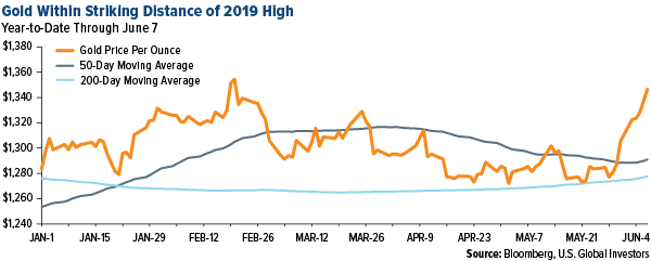 As an investor, I continue to have great faith in gold as a store of value during times of economic and geopolitical uncertainty. It’s behaved precisely as I expect it to. In response to heightened global trade concerns and weakening economic indicators, investors have piled into the yellow metal, pushing its price up for a remarkable eight straight days as of today. We haven’t seen such a winning streak since June 2014, when gold traded up for 10 straight days.