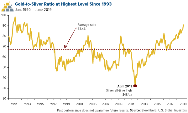 Another sign of slowing economic growth is the surging gold/silver ratio. This ratio tells you how many ounces of silver it takes to buy one ounce of gold. This week it crossed above 90 for the first time in 26 years, meaning silver has not been this undervalued relative to gold since the first year of Bill Clinton’s first term.