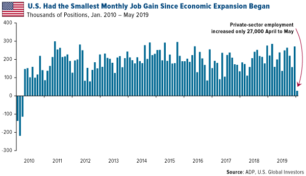 Indeed, there are a number of warning signs that suggest investors should proceed with caution as the U.S. economic expansion turns 10 years old. Global manufacturing growth reversed for the first time since 2012, with the purchasing manager’s index (PMI) falling for a record 13 months in May.