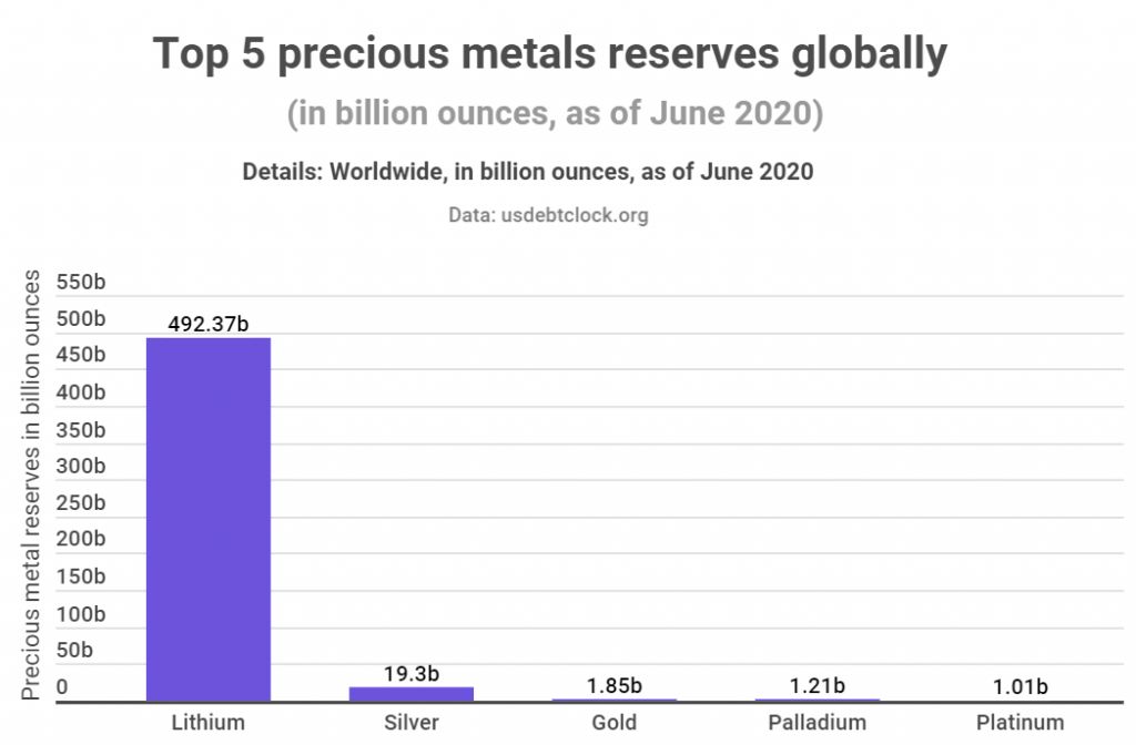 Research also investigated and calculated the number of ounces held by other precious metals globally. From the data, lithium holds the top spot with 492.37 billion ounces in global reserves. As of June 2020, silver had the second-highest reserves globally at 19.3 billion ounces.
