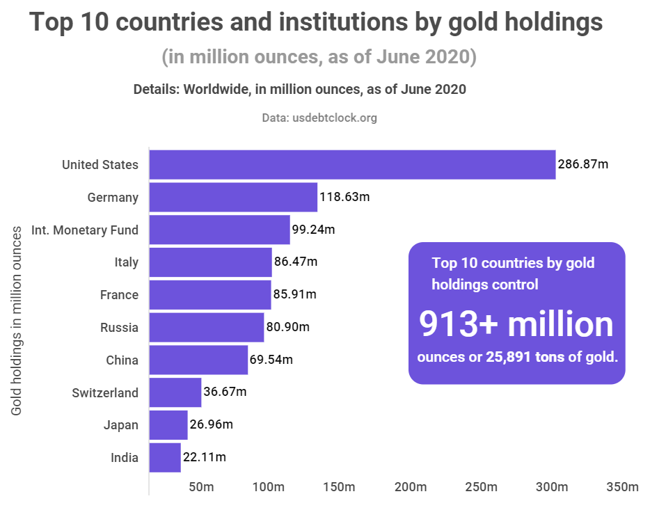 Globally, the total gold reserves stand at 1.85 billion ounces while the top ten countries cumulatively hold 913.29 million ounces in gold.