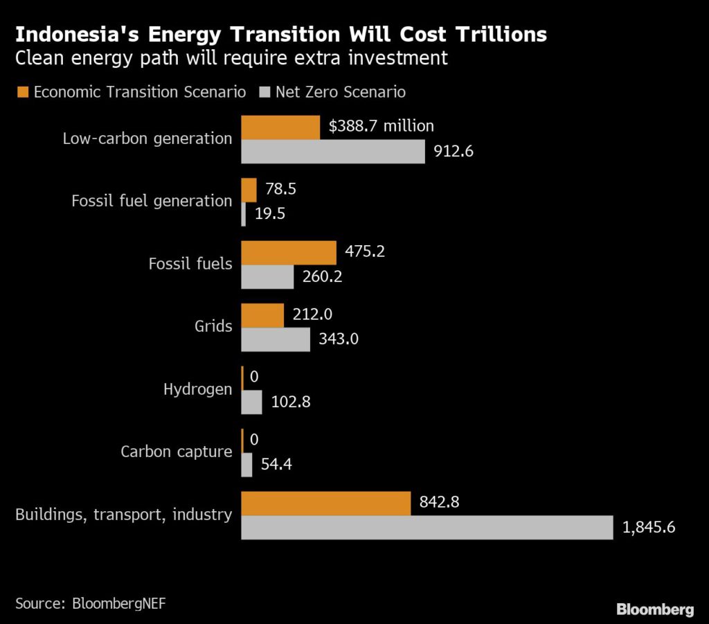 Setting aside a rapid energy transition, Indonesia would still require $2 trillion of investment into its energy system through 2050, according to BloombergNEF. Reaching net-zero by 2050 could cost $3.5 trillion.