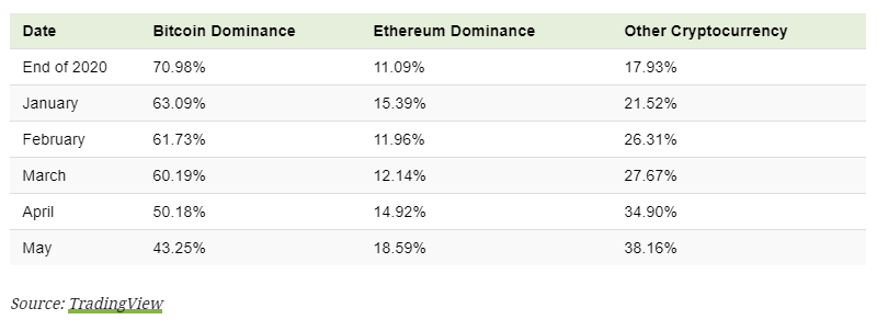 In just the past two months, bitcoin’s dominance in the crypto ecosystem has fallen from over 70% to 43%.