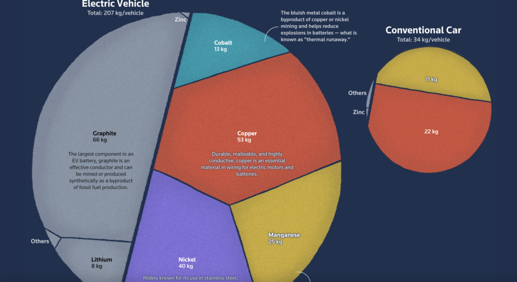 Many of the minerals that go into making an EV are becoming harder to find on land, pushing up mining costs in recent years. That’s increased prices for EVs and other electronics after they had fallen for years up to 2020. A typical EV needs six times more minerals in total than a vehicle powered by an internal combustion engine.
