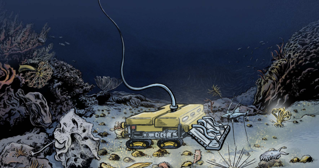 The most-prominent of the three proposed types of deep-sea mining involves using a giant robot that is sent down to the ocean floor from a support vessel.