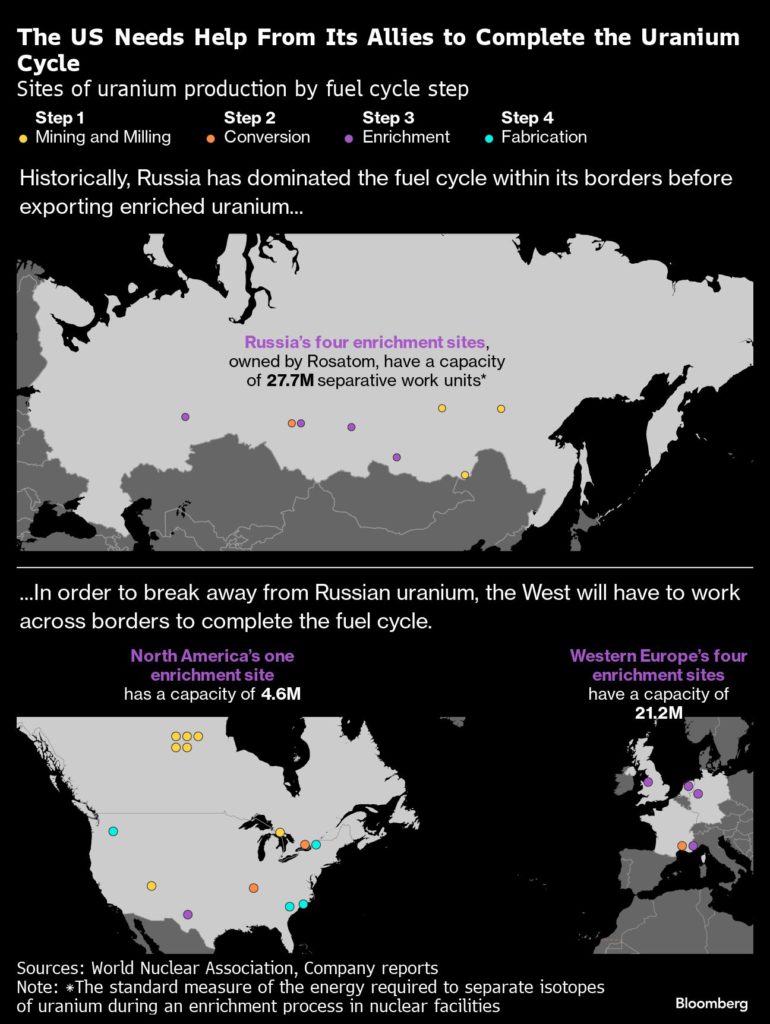 While welcome, those reassurances underscore the economic vulnerability behind the efforts to reboot the West’s uranium-fuel business. US President Joe Biden and Canadian Prime Minister Justin Trudeau pledged during a March meeting to diversify the nuclear fuel supply chain with “like-minded allies” and to better coordinate conversion, enrichment and fabrication. Within three weeks, they recruited France and the UK to help push Russia out of the nuclear fuel business altogether.