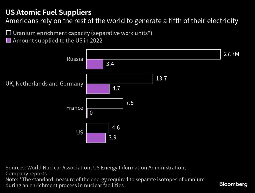 The trigger for that change of mind was the attack on Ukraine. Some 18 months on, Rosatom Corp. — the Kremlin-controlled nuclear group — is still the world’s biggest uranium enricher. It still supplies almost a quarter of America’s 92 nuclear reactors and dozens of other plants across Europe and Asia.