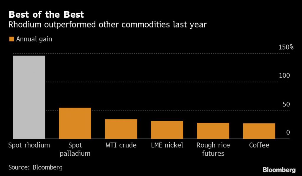 Rhodium — mainly used in autocatalysts and five times more costly than gold — surged 32% already this month, touching the highest since 2008. Stricter emissions rules have fuelled a multiyear rally and there’s speculation that investors are also jumping in, betting that prices will climb toward a record.