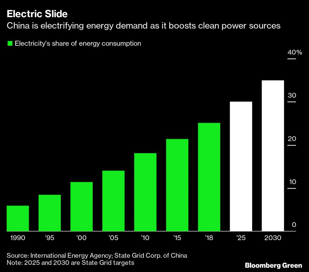 China is doing just that. Li said that increasing sources of electricity will be a goal over the next five years. Electricity represented about 25% of total energy use in 2018, according to the International Energy Agency, more than double the share in 2000. The country’s major utility says that percentage will rise to 30% by 2025 and 35% by 2030 as the nation expands its world-leading battery vehicle fleet.