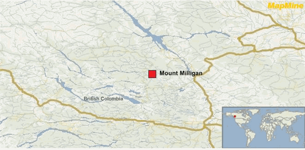 Mt. Milligan is located 155 km northwest of Prince George, BC. Map from Infomine.