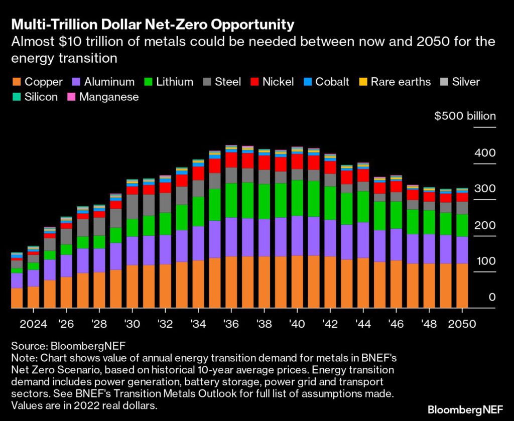 Getting to net zero could require almost $10 trillion of metals between now and 2050, according to BloombergNEF, with annual demand peaking at close to $450 billion in the mid-2030s. While steel and aluminum are expected to see the most demand growth in terms of absolute volume, copper is set to be the most valuable opportunity, with an estimated $3.4 trillion of the red metal needed to avert climate disaster.