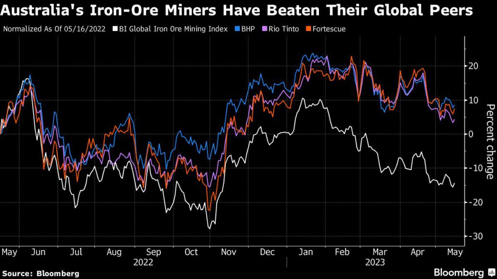 Iron ore has struggled after a strong start to the year amid concern China’s recovery is losing momentum. Still, Australian miners have weathered the commodity’s gyrations better than most of their international rivals, with BHP, Rio Tinto and Fortescue Metals Group Ltd. outperforming a Bloomberg Intelligence gauge tracking producers of the commodity over the last 12 months.