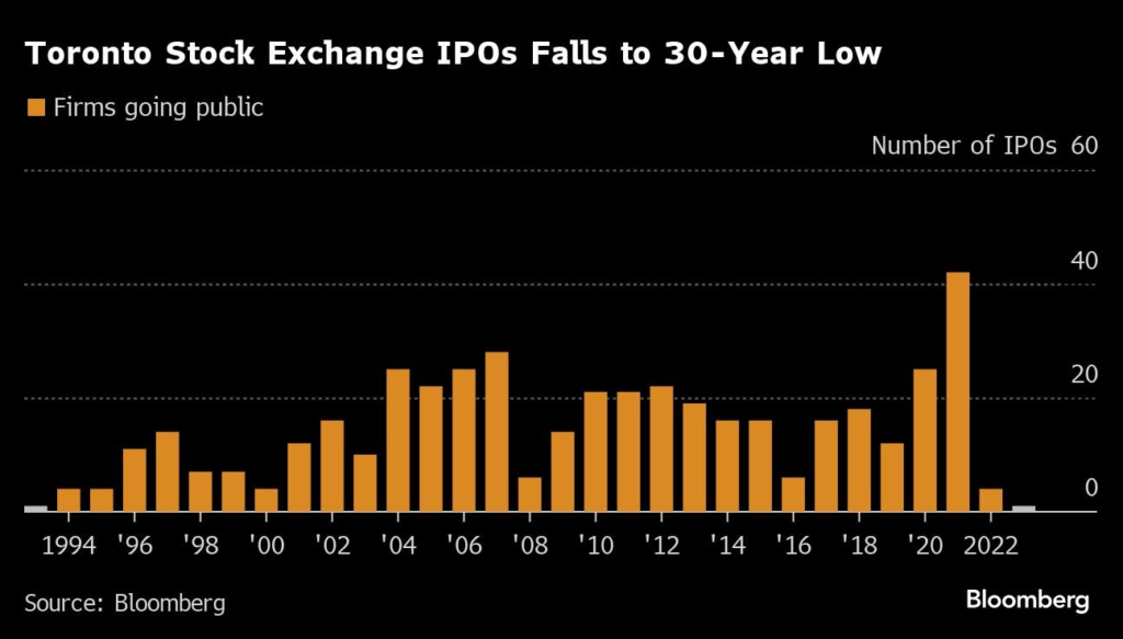 Canada’s largest stock exchange is in the midst of a historic dry spell for initial public offerings and it’s unlikely to improve anytime soon.