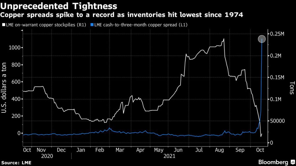 The drawdown has made the trading house the talk of the copper market, helping to drive available stocks to the lowest since 1974 and pushing a key spread to the highest on record. It’s also helped to spur outright copper prices higher, with benchmark futures up about 13% since the start of the month and approaching record highs set in May.