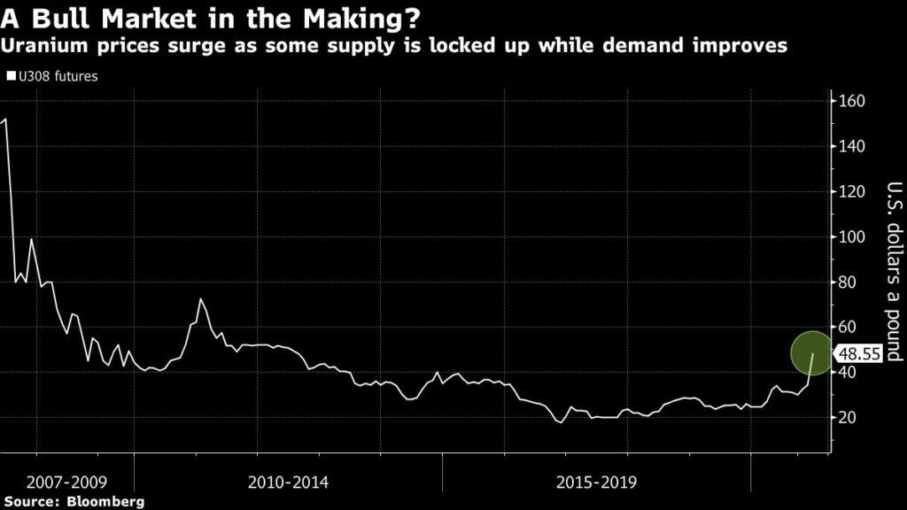 Meanwhile, the Kazakh producer Kazatomprom is now in talks to supply the metal directly to Sprott for deliveries that would potentially start in 2022. The miner also warned of a “small risk” it wouldn’t reach its output target for 2021, and it said earlier this year it would keep its production at reduced levels through 2023.
