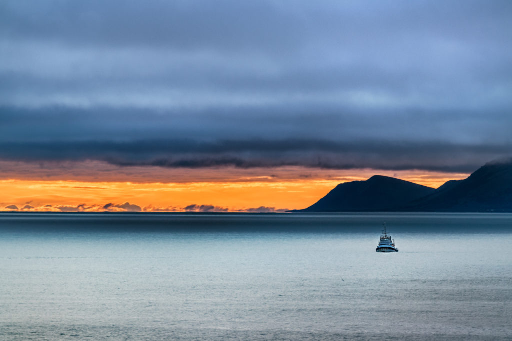 Scenery of a small ship on the Bering sea. Stock image.