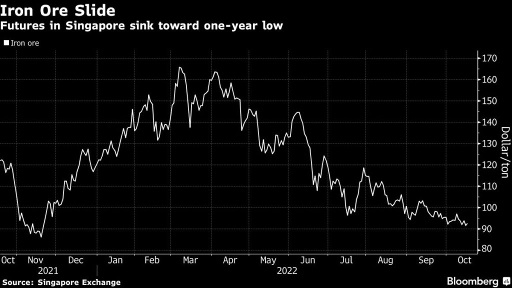 Concerns over the cooling impact of higher interest rates, as well as China’s zero-Covid policy and a recent push for pollution curbs, have iron ore futures trading near their lowest this year. So far, China’s peak building season has failed to ignite a recovery.