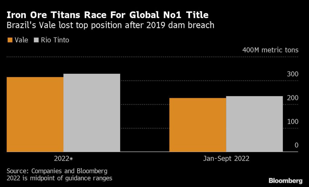 Seasonal factors mean production is usually stronger in the second half. The Brazilian miner lost the title of top iron ore supplier to Rio Tinto in the wake of a 2019 dam breach. The rival — which flagged tougher market conditions for commodities producers — saw its shipments 1% lower, and put its full-year output estimates at the low end of the 320-335 million tons forecast.