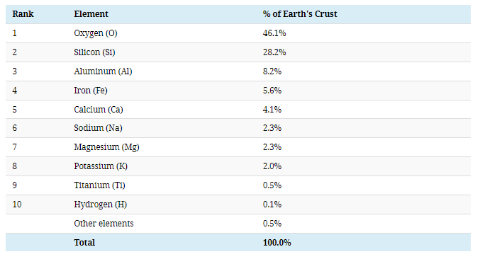 Oxygen is by far the most abundant element in the Earth’s crust, making up 46% of mass—coming up just short of half of the total.