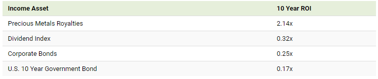 While not every precious metals royalty will provide the outsized returns seen from Goldstrike, an average sample of royalties has generally outperformed other income investments over a 10-year time period.