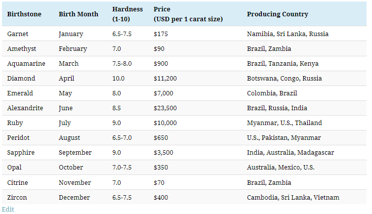 Gemstone prices can vary from $68 per carat for citrine (November) up to $23,500 per carat for Alexandrite (June). The United States is the leading global market, buying roughly $24 billion in gemstones per year.