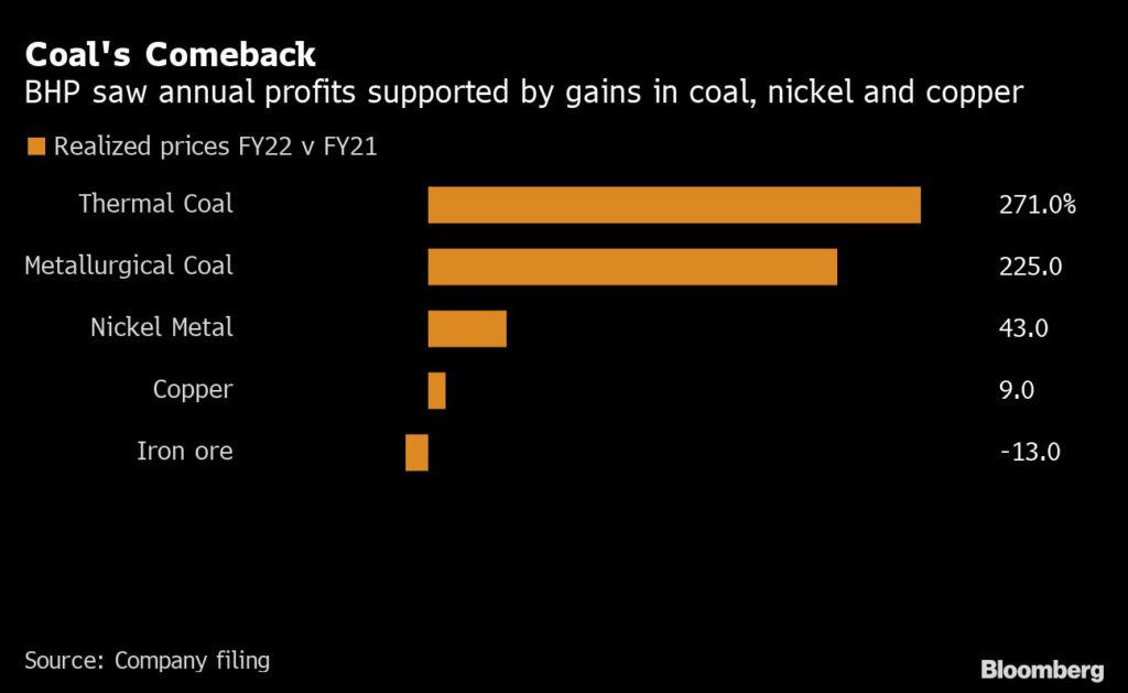 Energy coal also broke price records as trade flows were redirected from Asia to Europe as a result of curbs on Russian exports and on gas-to-coal switching as LNG prices spiked, BHP said. Over the longer-term, total primary energy derived from coal — both for power and other uses — is expected to be challenged, particularly under deep decarbonization scenarios where demand is expected to decline, BHP said.