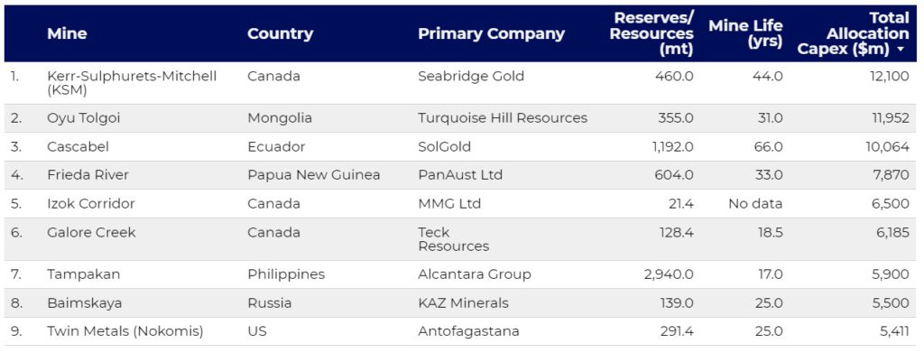 In first place is Seabridge Gold’s KSM project in British Columbia, Canada with a capex allocation of $12.1 billion. In November 2020, Seabridge refiled the technical report: Proved Reserves: 460mnt; Mine Life: 44 years. The project includes Kerr, Sulphurets, Mitchell and Iron Cap deposits.